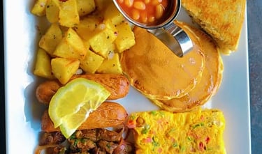 (Waffles or pancakes, Eggs, sausages, tomato, potatoes, served with tea and juice)
