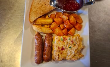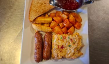 (Any style of eggs, sausages, plantain, home fries ,toasted bread & tomato ,served with tea and juice )