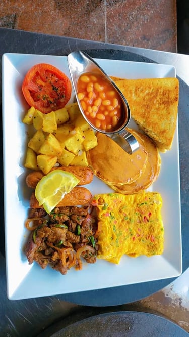 (Beef Strips, Fried Mushrooms, Tomato, Beans Sausages, Eggs, Bread, Pancake, Home Fries Served with Tea and Juice):